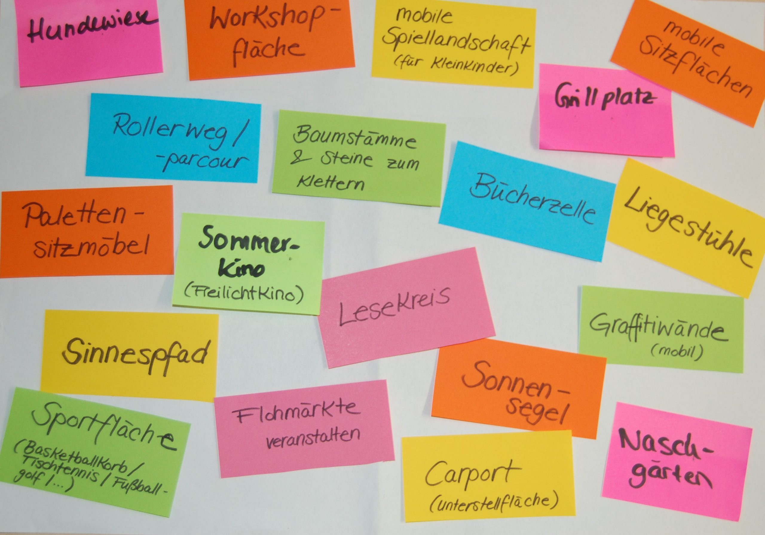 Geplant sind u. a. selbstgebaute Palettenmöbel, weitere Sitzgelegenheiten, mobile Bepflanzung in Hochbeeten und/oder Kübeln, ein Sinnespfad, selbst angelegte Naschgärten, mobile Graffitiboards, eine Fläche für Lesungen, Filmvorführungen oder Workshops sowie ein Aufenthaltsbereich für Kinder – so entstehen Angebote für alle Altersgruppen.