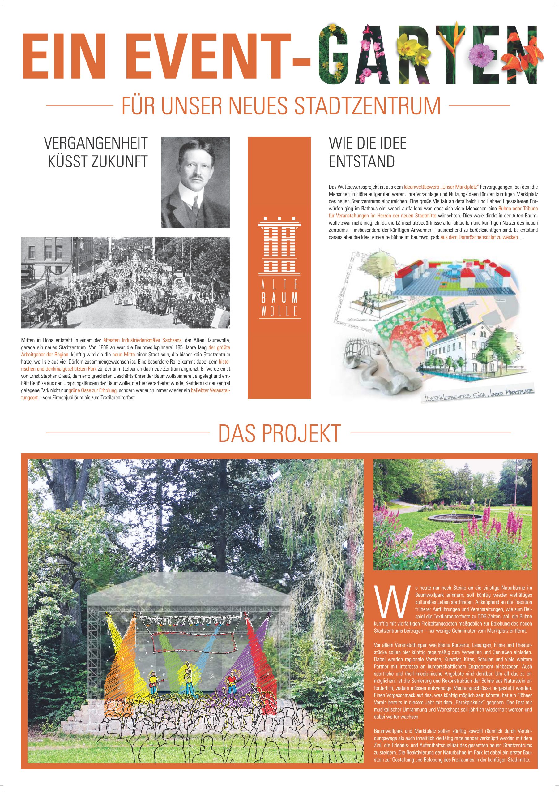 Das mit dem 3. Preis (10.000 €) und einem Sonderpreis (9.000 €) prämierte Projekt beinhaltet die Rekonstruktion und Wiederbelebung der historischen Bühne im Baumwollpark sowie deren Verknüpfung mit dem neuen Stadtzentrum und dem zukünftigen Marktplatz.